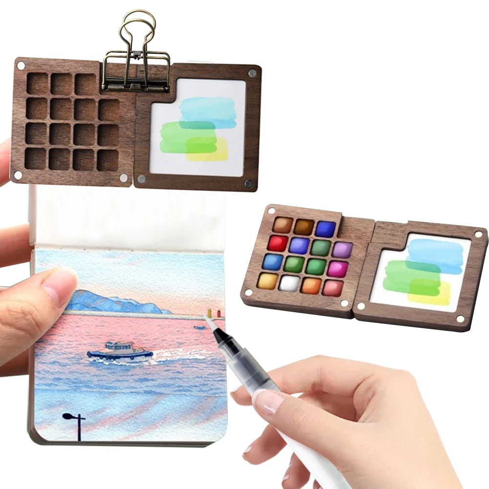 Mini Walnoot Houten Aquarel Palet Draagbare Verfdoos Met Clip Reizen Schilderen Verfbakje Kunstbenodigdheden Schetsboek Palet