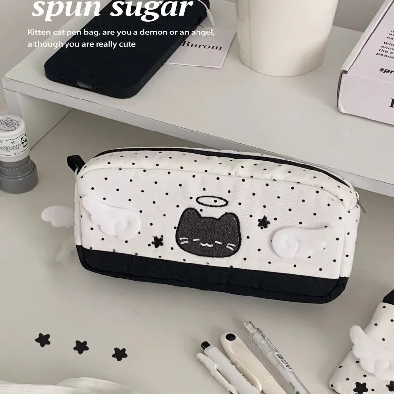 Leuke Cartoon Angel Demon Cat Etui Zwarte Polka Dot Make-up Tasje Grote Capaciteit Briefpapier Organizer voor Schoolbenodigdheden