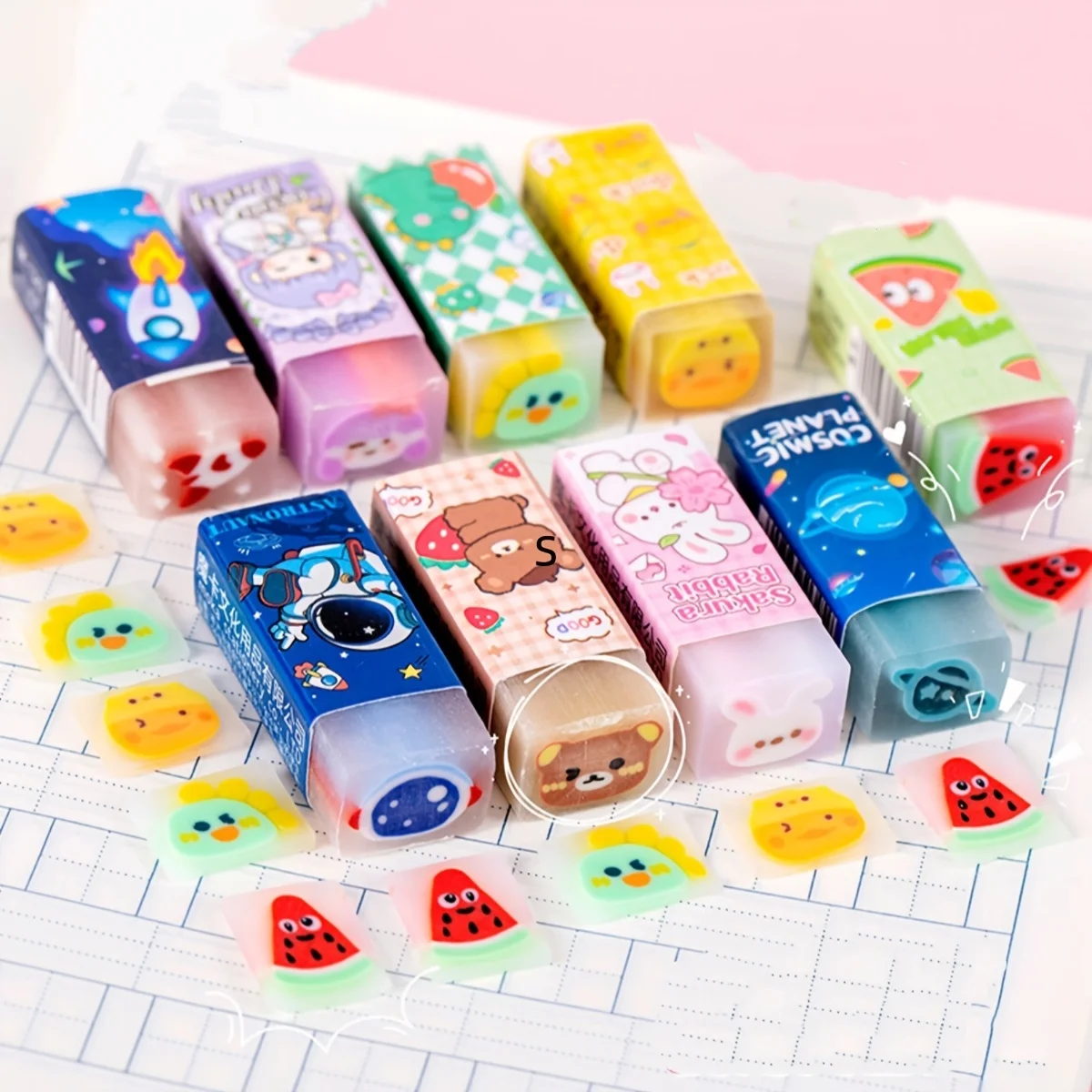 13-delige set willekeurig geassorteerde jelly-gummetjes, gummetjes gevuld met cartoonfruit, specifieke gummetjes voor studenten, stofvrije gummetjes, kleuterschoolprijzen