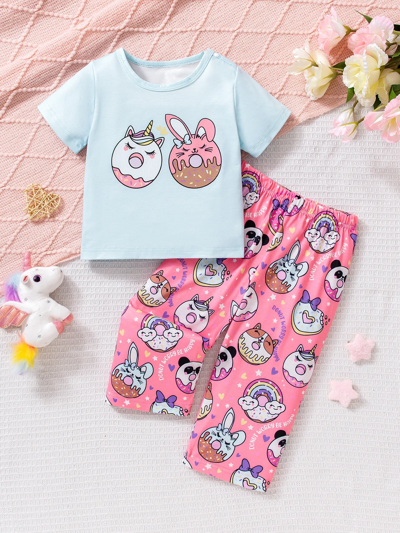 Baby zomeroutfitset Eenhoorn Konijn Donut Cartoon Korte mouwen + shorts Jongens en meisjes Schattig Zacht katoen Ademend Tweedelige set voor thuis en buiten