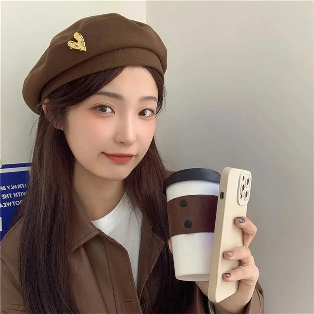 Herfst Winter Wollen Baret Hoed Voor Vrouwen Retro Metalen Hart Achthoekige Cap Mode Verdikte Winddicht Warme Preppy Stijl Hoed