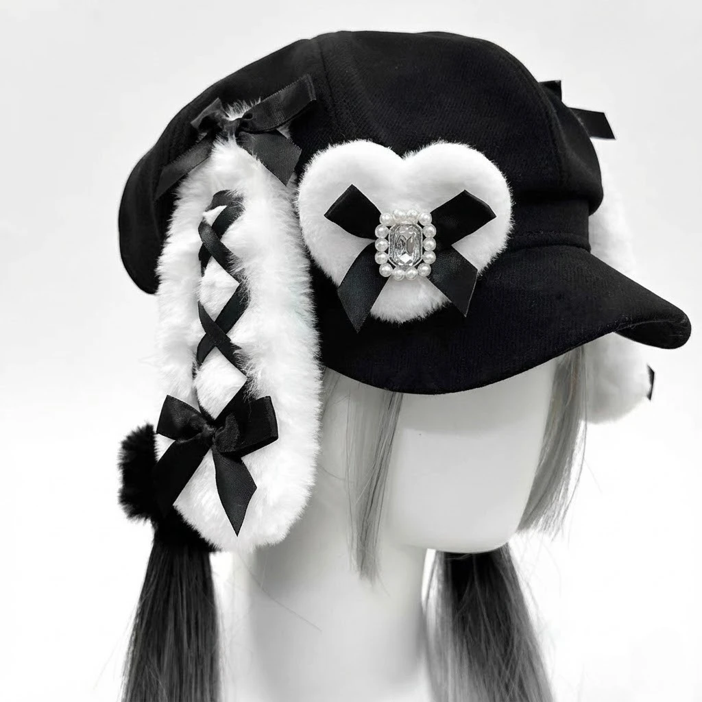 Japanse Harajuku Lolita Hoed Zwarte Krantenjongenspet Pluche Bunny Oren Hart Gem Boog Decoraties Gothic Y2K Meisje Leuke Zoete Caps