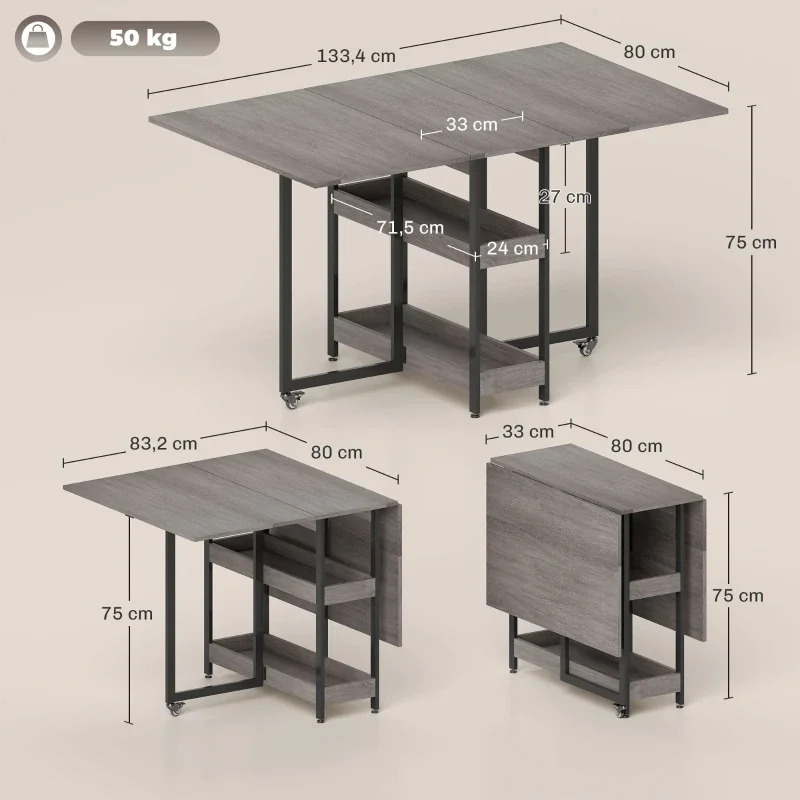 Opvouwbare eettafel, verplaatsbare eettafel, klaptafel voor eetkamer, keuken, afmeting 133,4 x 80 x 75 cm, grijs