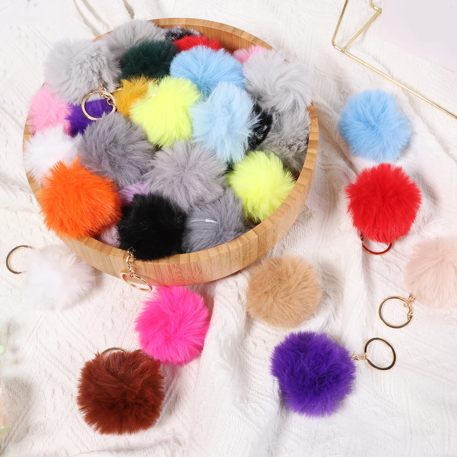 60 Stuks Pluizige Pompom Sleutelhanger Vrouwen Luxe Pompom Sleutelhanger Accessoire Goud Kleur Kettingen Pompons Nep Vos Konijnenbont Charms Keten