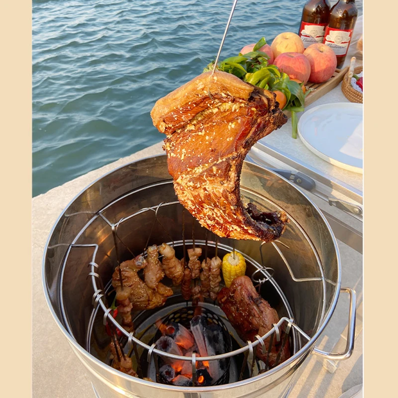 Hangende BBQ-grill van roestvrij staal met houtskoolrek en 100 spiesjes – rookvrije campinggrill voor buiten en hangende kippenrooster