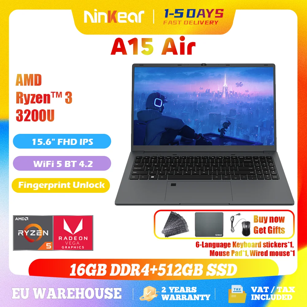Ninkear A15 Air 2025 laptop 15,6 inch FHD IPS-scherm AMD Ryzen 3 3200U 16 GB DDR4 + 512 GB SSD WiFi 5 BT 4.2 Getest PC van hoge kwaliteit