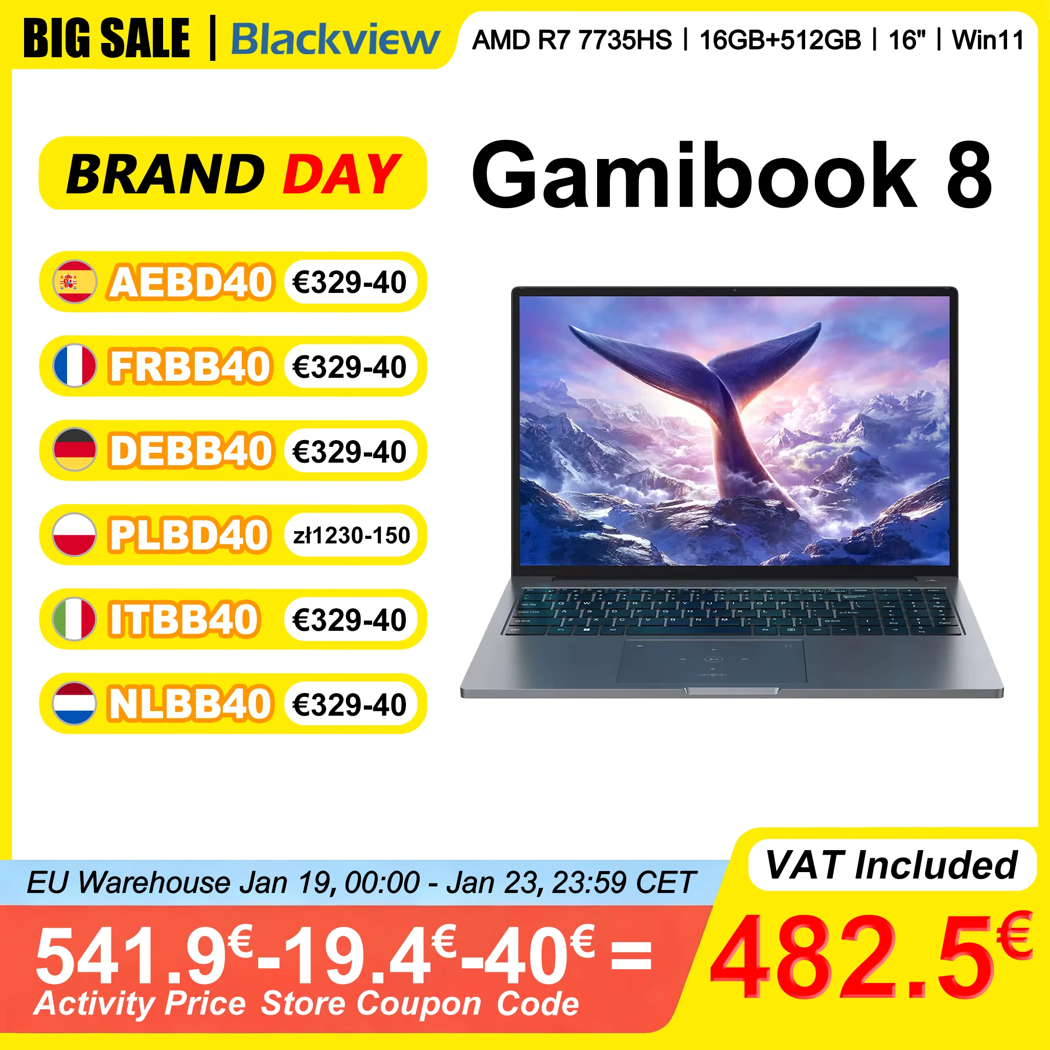 Blackview GamiBook 8 Laptop 16 Inch AMD R7 7735HS LPDDR5 16GB/32GB RAM 512GB/1TB ROM Windows 11 Pro BT5.2 Wifi6