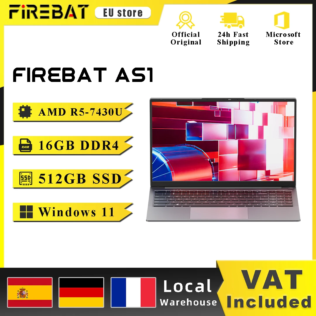 Firebat Laptop AS1 AMD R5-7430U 16GB DDR4 512GB SSD 15,6 inch IPS Windows 11 Type-C WIFI6 Verlicht toetsenbord met volledige toetsenbordgrootte Notebook