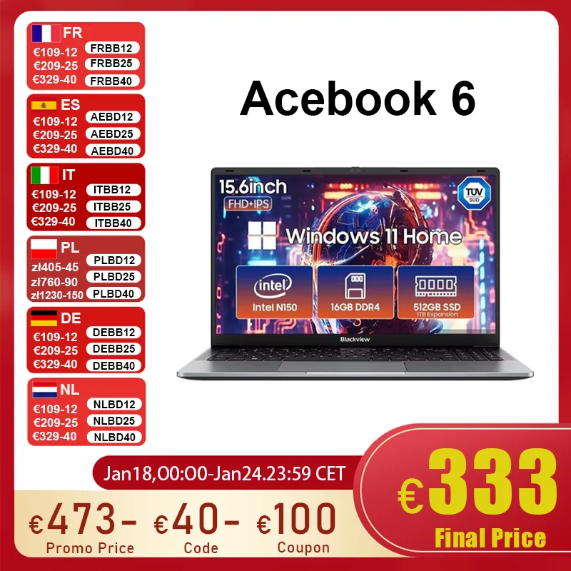 Blackview Laptop AceBook 615,6" FHD IPS Intel Twin Lake N150 16GB RAM 512GB SSD + uitbreiding tot 1TB Windows 11 Home Notebook