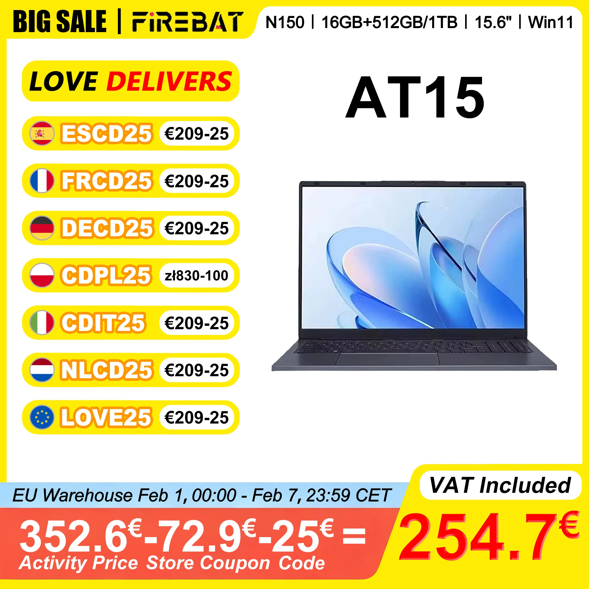Firebat AT15 15,6 inch Full HD 16GB DDR4 512GB/1TB SSD Intel N150 Windows 11 Light Business Computer Notebook BT4.2 WiFi5