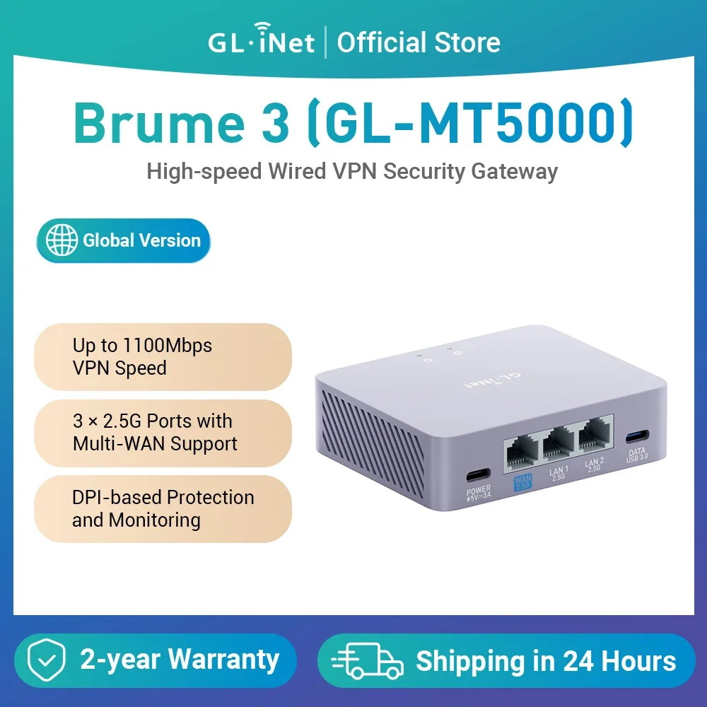 GL-iNET (Brume 3) GL-MT5000 High Speed Wired VPN Security Gateway, tot 1100 Mbps VPN, 3× 2.5G Multi-WAN, DPI-beveiliging, GEEN Wi-Fi