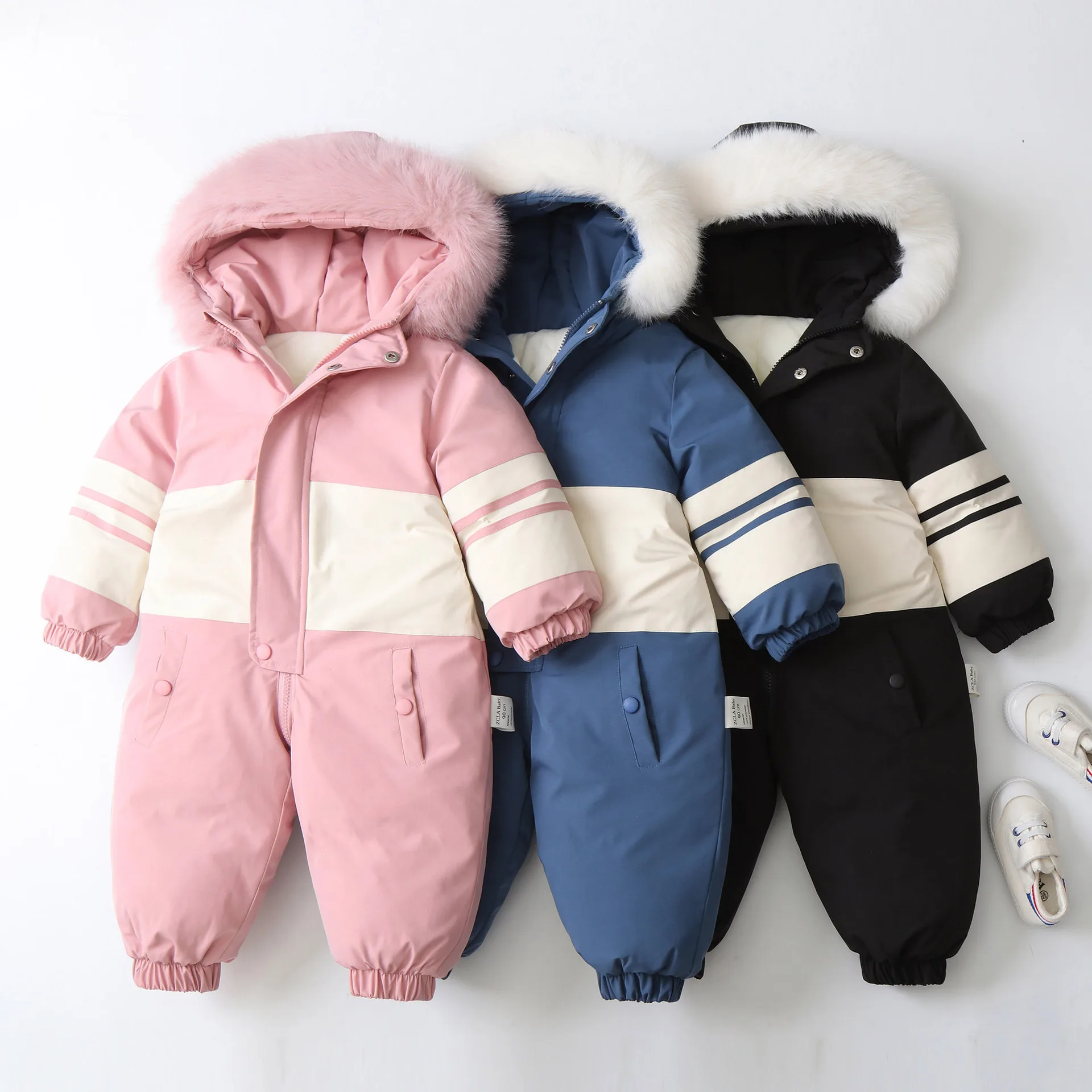 Winter Baby Baby Romper Gestreept Nepbont Capuchon Dikker Peuter Skipak Fleece Warme Kinderen Kleine Jongens Jumpsuit Meisje Parka 1-5Y