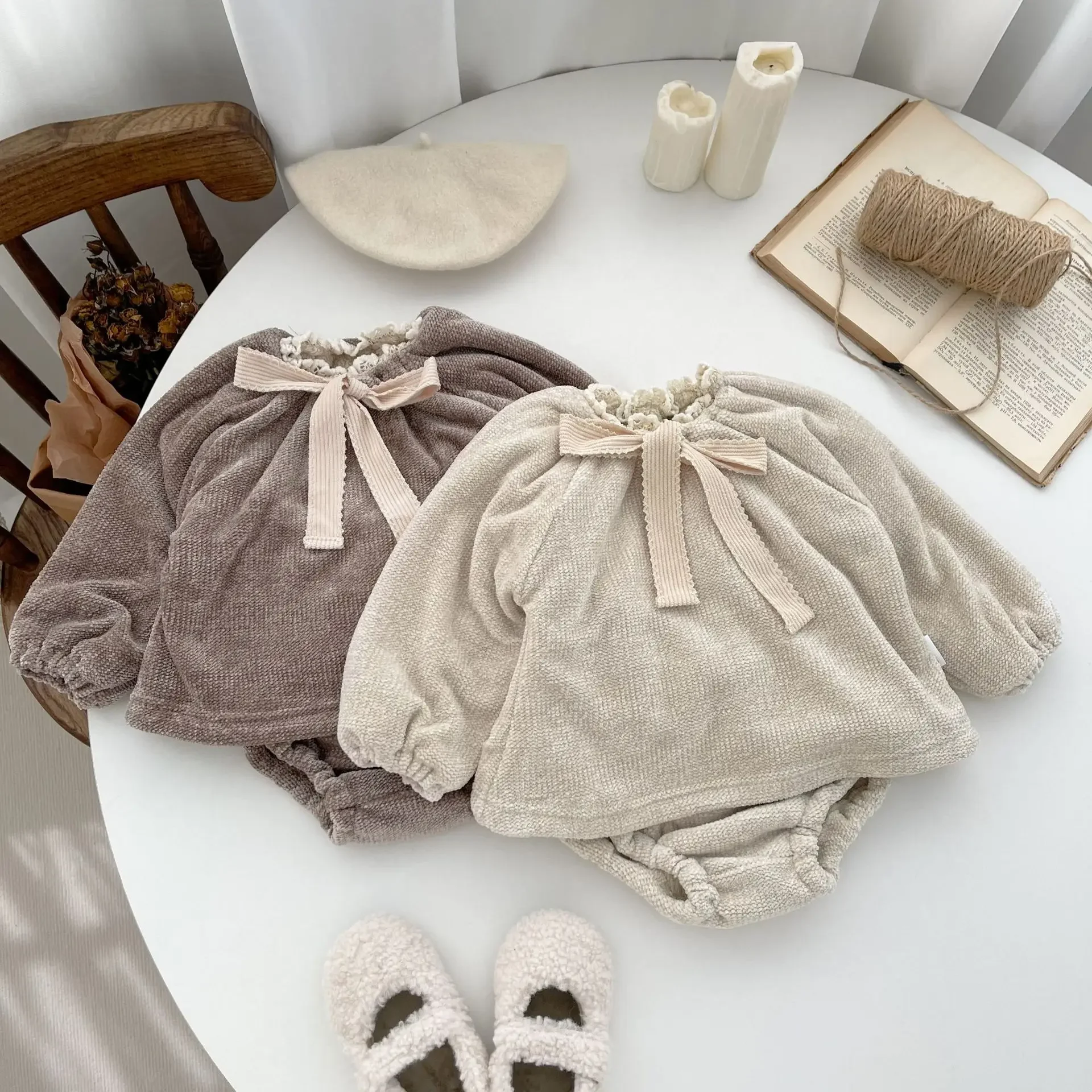 Dubbelzijdig pluche babysets babymeisjeskledingset winter dubbellaags pluche peuter trui set strik set top broek 2 stuks