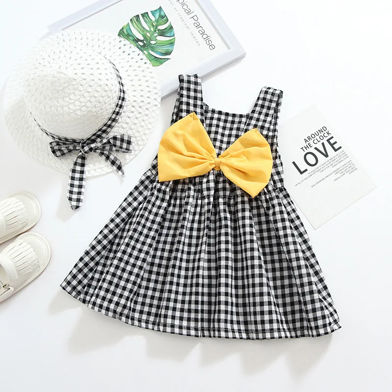 2 Delige Set Zomer Pasgeboren Meisjes Kleding Koreaanse Mode Leuke Plaid Bloemen Mouwloze Baby Jurken + Zonnehoed Luxe Baby Oufit 001