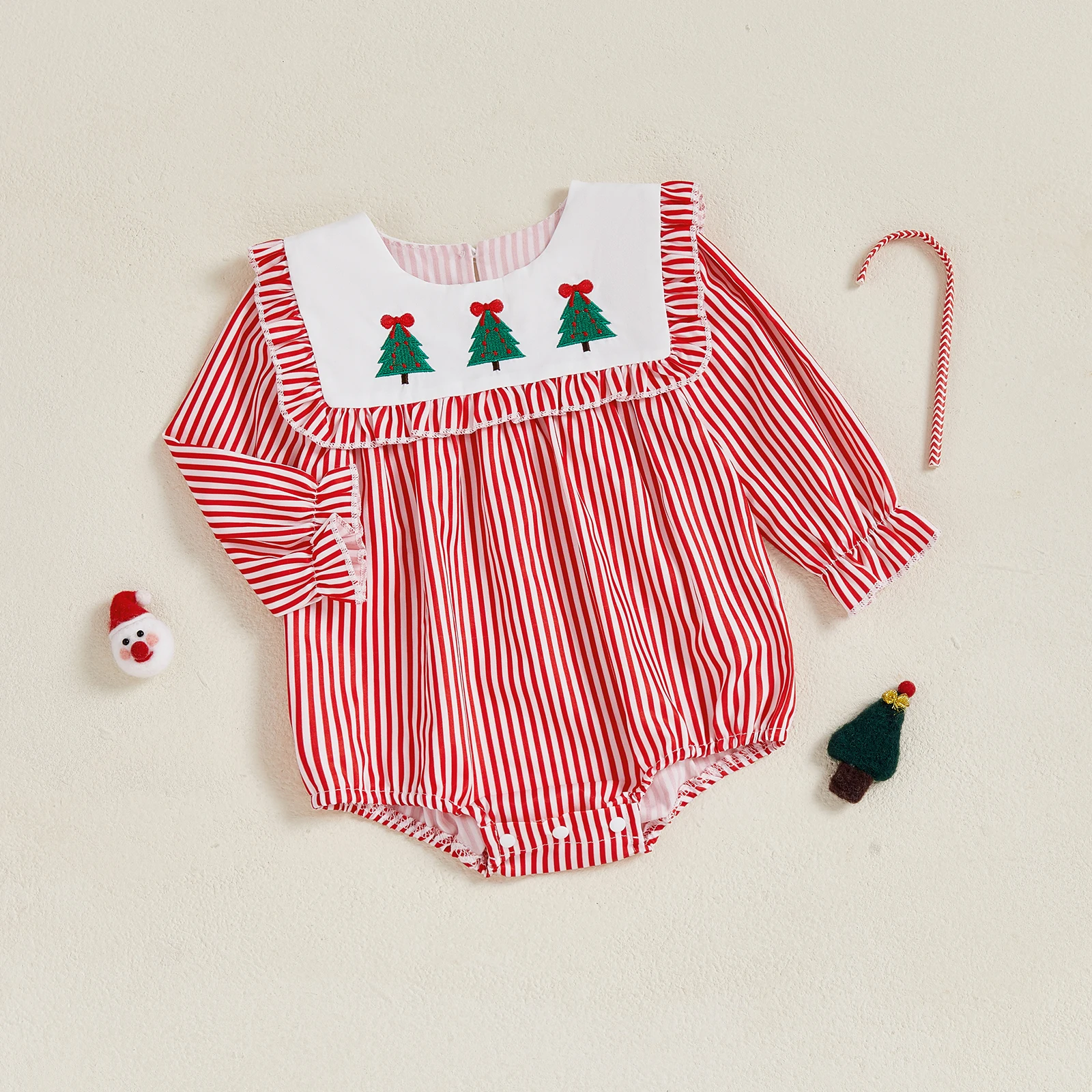 Kerstrompertje voor babymeisjes, gestreept, vakantieboom, ruches, gesmokte bodysuit met lange mouwen, leuke winter-herfstkleding