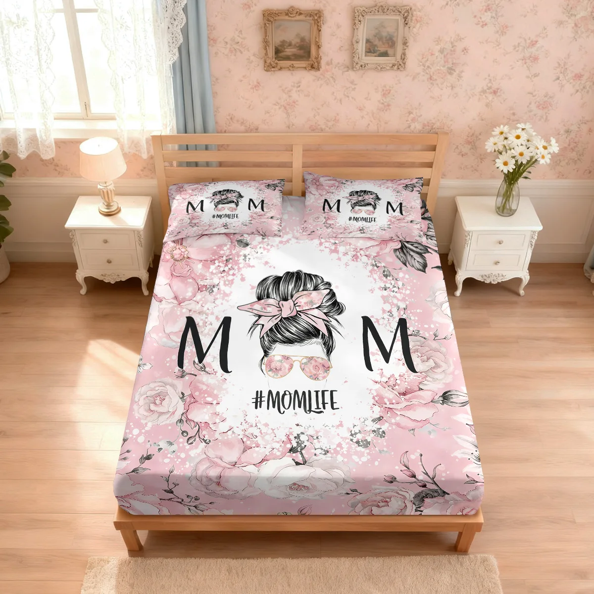 3-delige Moederdag roze bloemenprint chiploze beddengoedset, meerdere maten, bedovertrek, beddecoratie, machinewasbaar