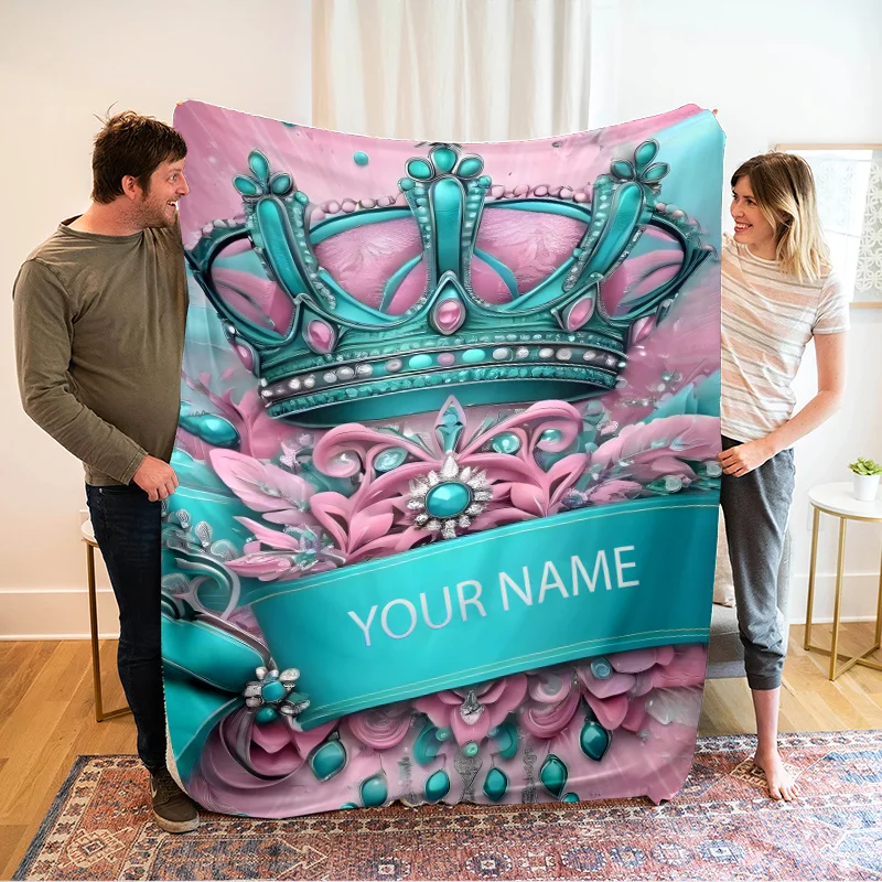 Gepersonaliseerde kroonflanellen deken met aangepaste naam en tekst, luxe roze en turquoise bedrok en dekbed - comfortabel