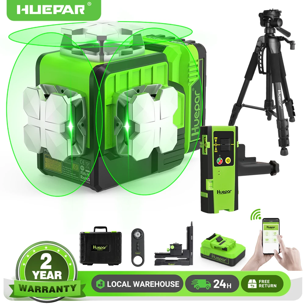 Huepar 12-lijnen 3D groene laserniveau met afstandsbediening, Bluetooth, ontvanger/statief, zelfnivellerende en magnetische basis voor constructie P03