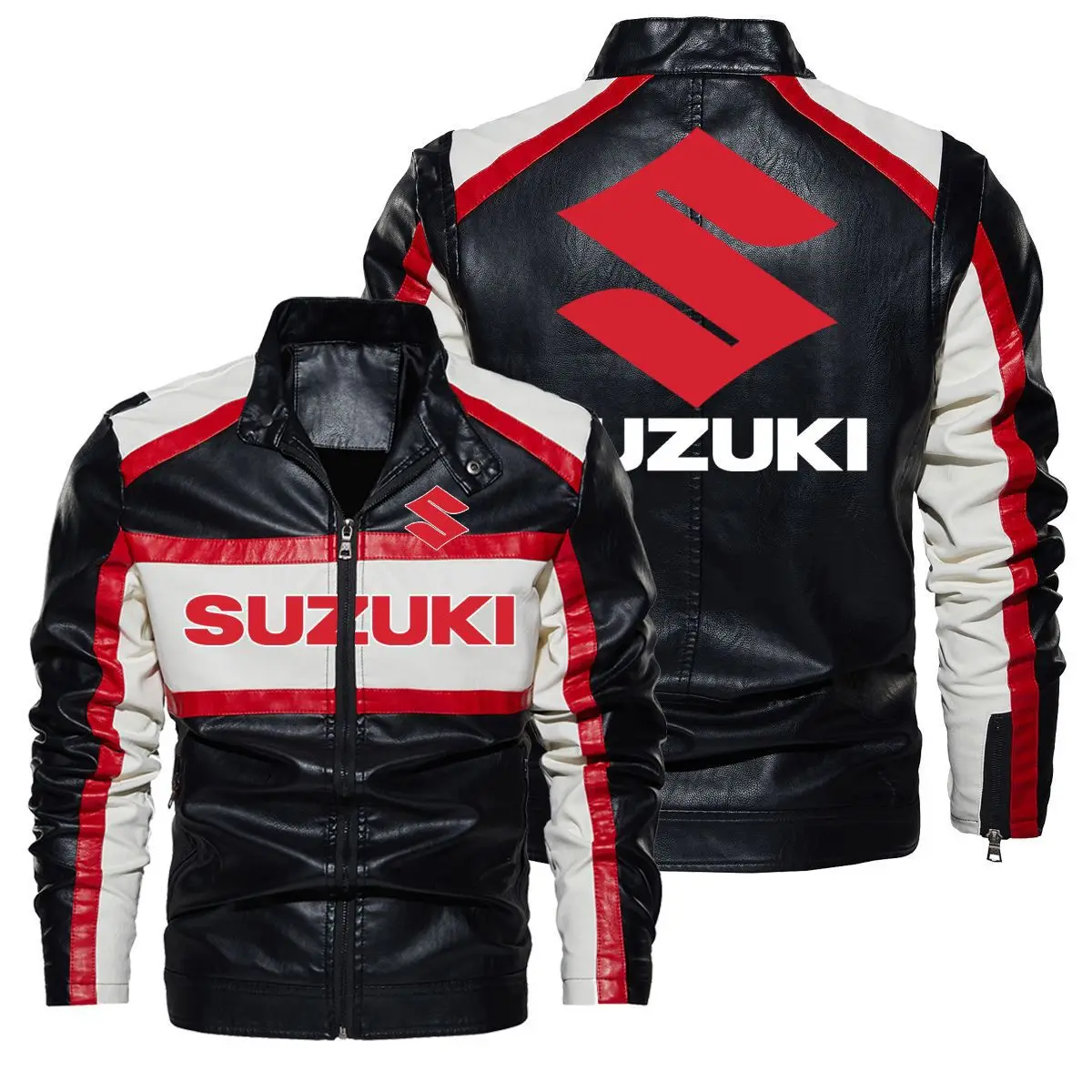Suzuki leren jas, hoge kraag, ritsontwerp, kleurblokkering, winddicht leren motorjack, herenkleding