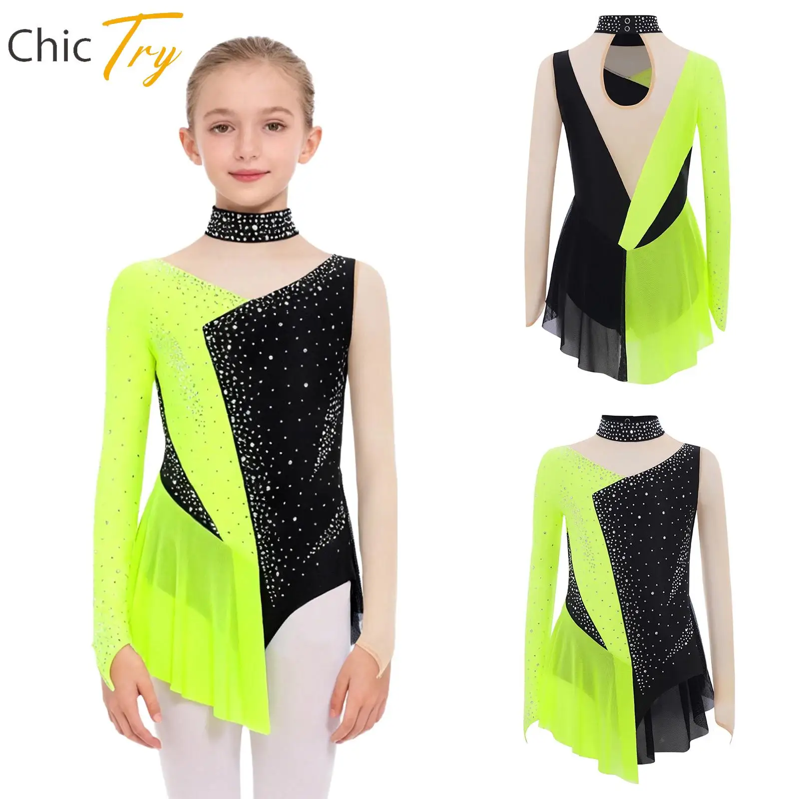 Kinderen Meisjes Lange Mouw Kunstschaatsen Jurk Glanzende Strass Sheer Mesh Tutu Ballet Gymnastiek Dans Turnpakje Jurk Danskleding
