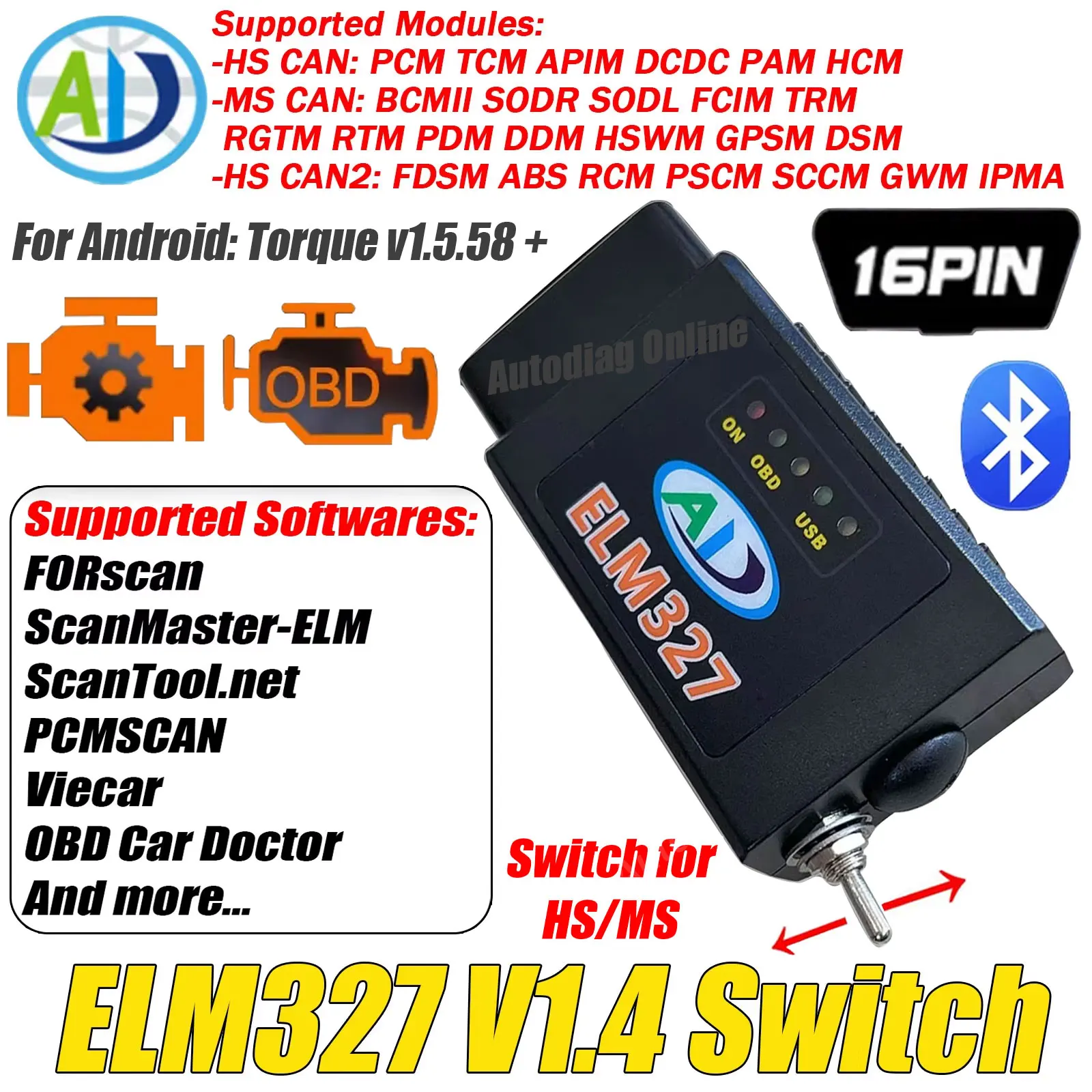 ELM327 V1.4 Bluetooth OBD2 Scanner PIC18F25K80 FTDI FT232RL Chip Voor Ford FORScan Schakelaar voor HS/MS KAN ELM327 Diagnostic Tool