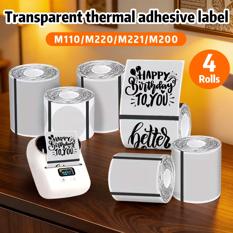 4 rollen transparante thermische labels compatibel met M110, veelzijdige formaten voor barcode, adres, verzending, kleding, thuislabeling