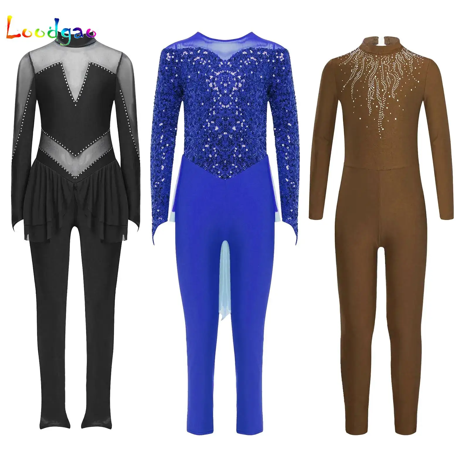 Kid meisjes kleurblok gymnastiek jumpsuit lange mouw glanzende strass bodysuit full body turnpakje voor ballet dans yoga schaatsen