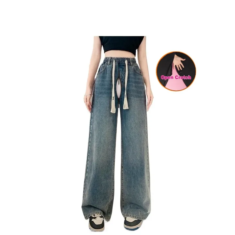 Dames open retro elastische taille jeans met trekkoord Dames lente Koreaanse versie Ins hoge taille skinny student recht breed