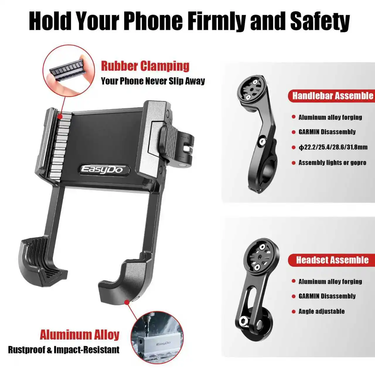 Easydo Fietstelefoonhouder Aluminium Fietstelefoonhouder Anti-vibratie Stuur/Headset Mobiele telefoonhouder voor 4,7-7”Telefoon GoPro