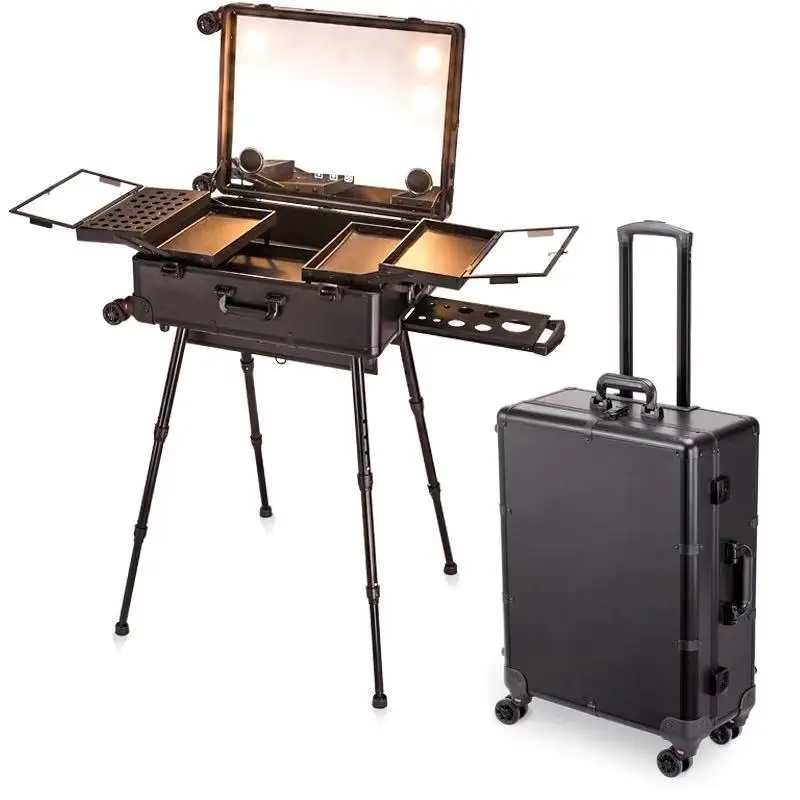 Reizen Vouwen Cosmetische Trolley, Professionele Make-Up Tafel Met Led Spiegel, Trolley Cosmetische Bagage, Rolling Bagage Case