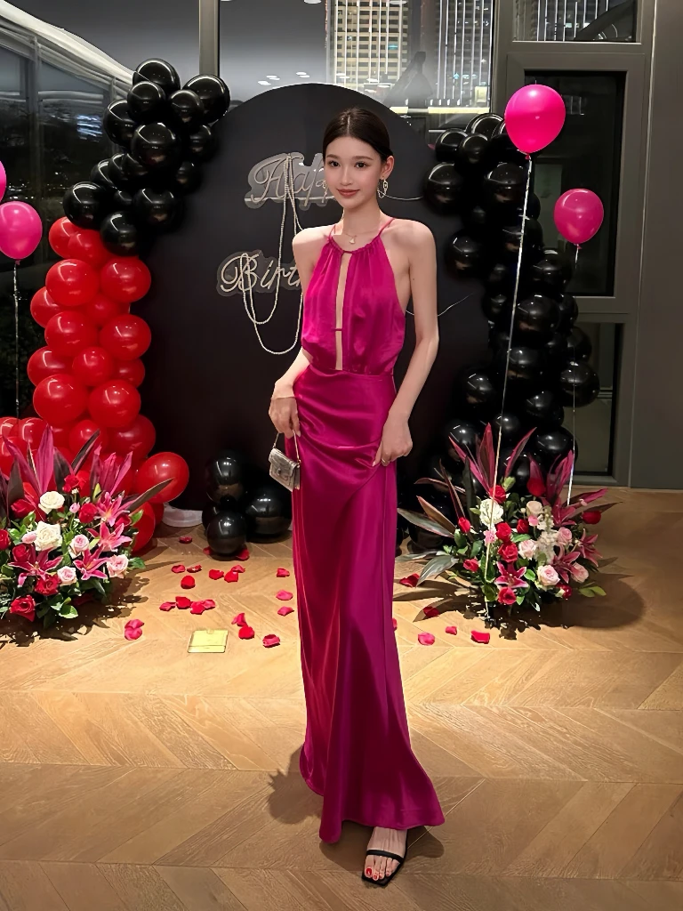 Roze zeemeermin-avondjurk Halter Rugloos Ronde hals Mouwloos Speciale gelegenheid Bruiloftsgast Cocktailparty voor dames