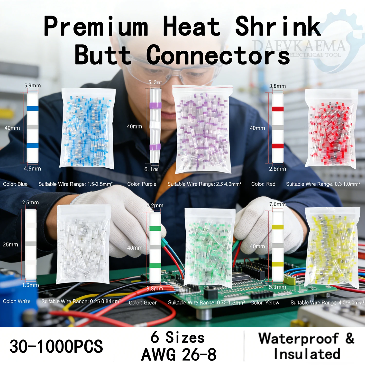 Soldeer Ring Seal Wire Krimpkous Butt Connectors Waterdichte geïsoleerde elektrische terminals, 30-1000PCS, 6 maten AWG 26-8