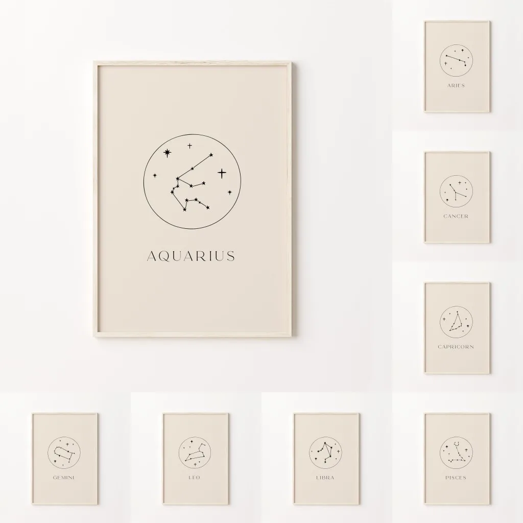 Minimalistische astrologie kunstprint crème beige en zwart dierenriem wanddecoratie sterrenbeeld neutrale sterrenbeeld canvas poster