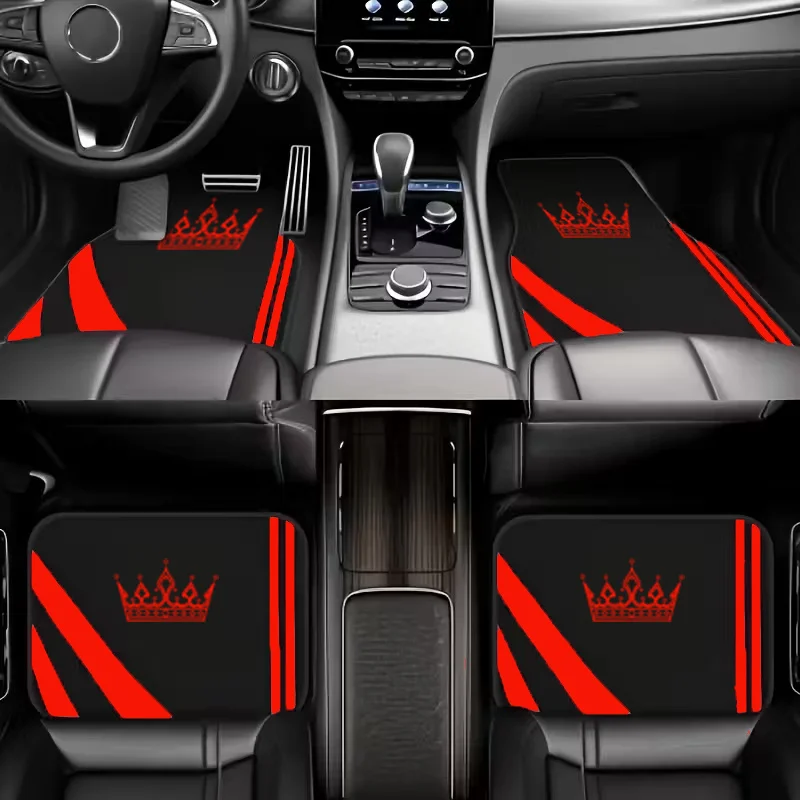 4-delige set roze/rood/blauwe autovloermatten met kroonprint | Duurzame polyester interieuraccessoires, universeel geschikt voor vrachtwagens, SUV's, Se