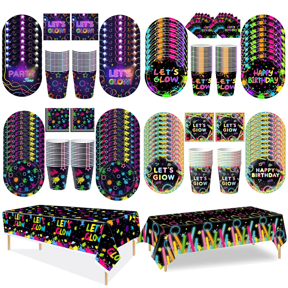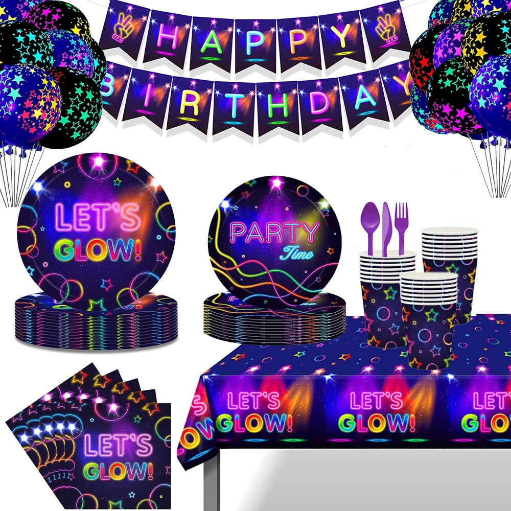 Let's Glow Party Serviesgoed Bekers Papieren Borden Servetten Banner Ballonnen Neon Glow Thema Verjaardag Disco Party Decoraties Benodigdheden