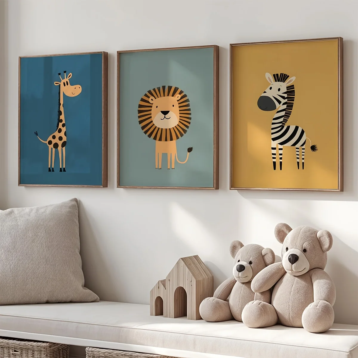 Ingelijste, 3 stuks Wildlife Zebra Leeuw Giraffe Wall Art Decoratieve Schilderijen, Marineblauw, Saliegroen en Geel Canvas Posters, Ro