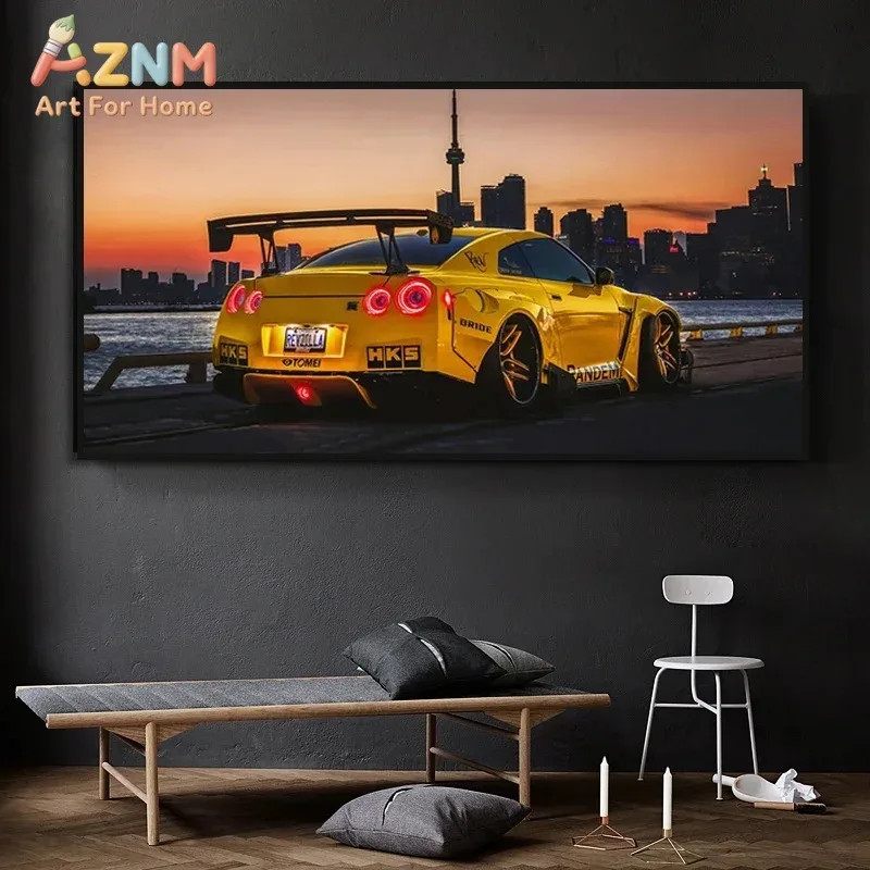 AZNM Nissan GT-R R35 Geel JDM Widebody Wall Art Print, enkele ongeramde canvasposter, gemodificeerde supercar met Toronto City Skyl