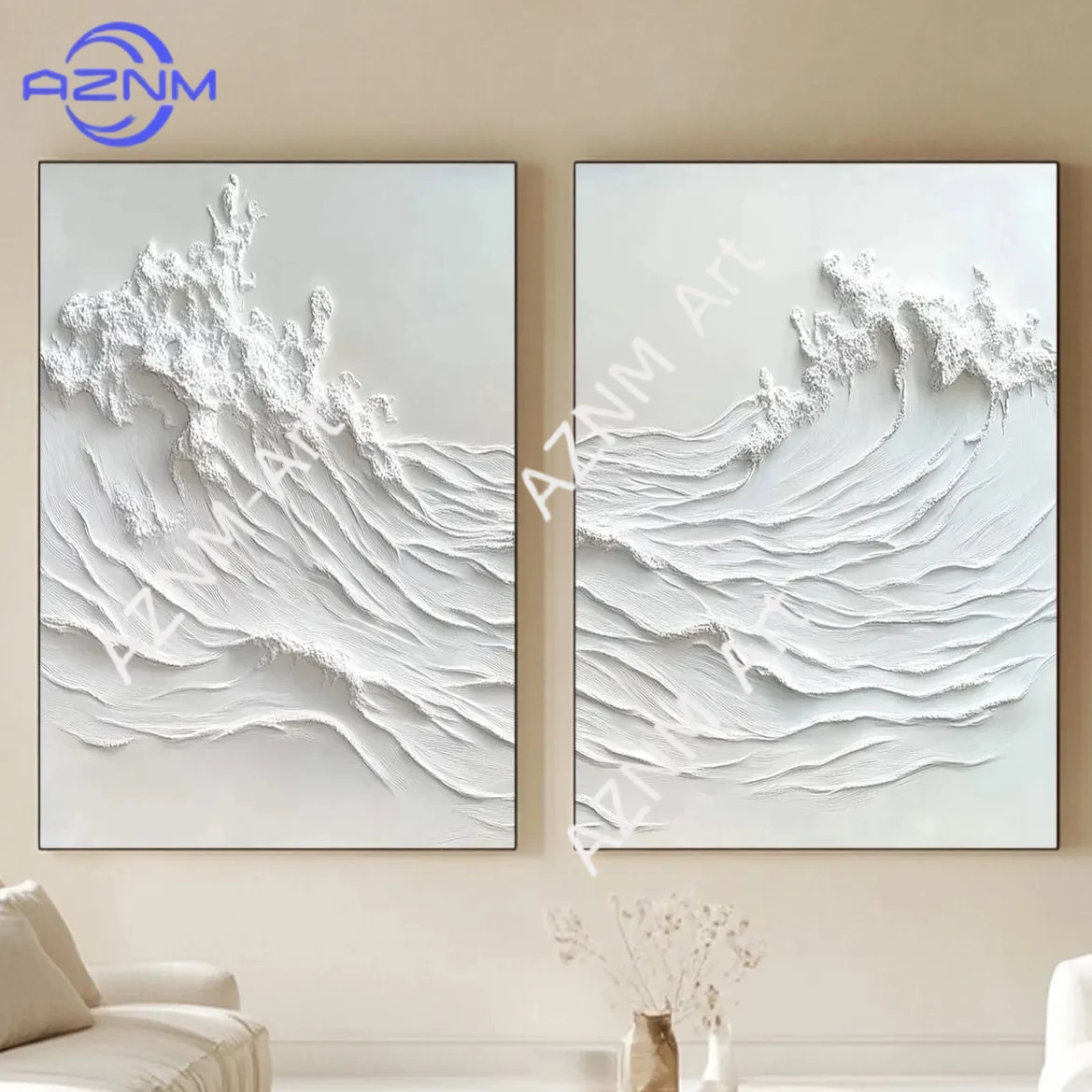 1/2 stuks handgeschilderde abstracte gipsen golfen schilderij, set van 2 witte getextureerde Wabi-Sabi wanddecoraties
