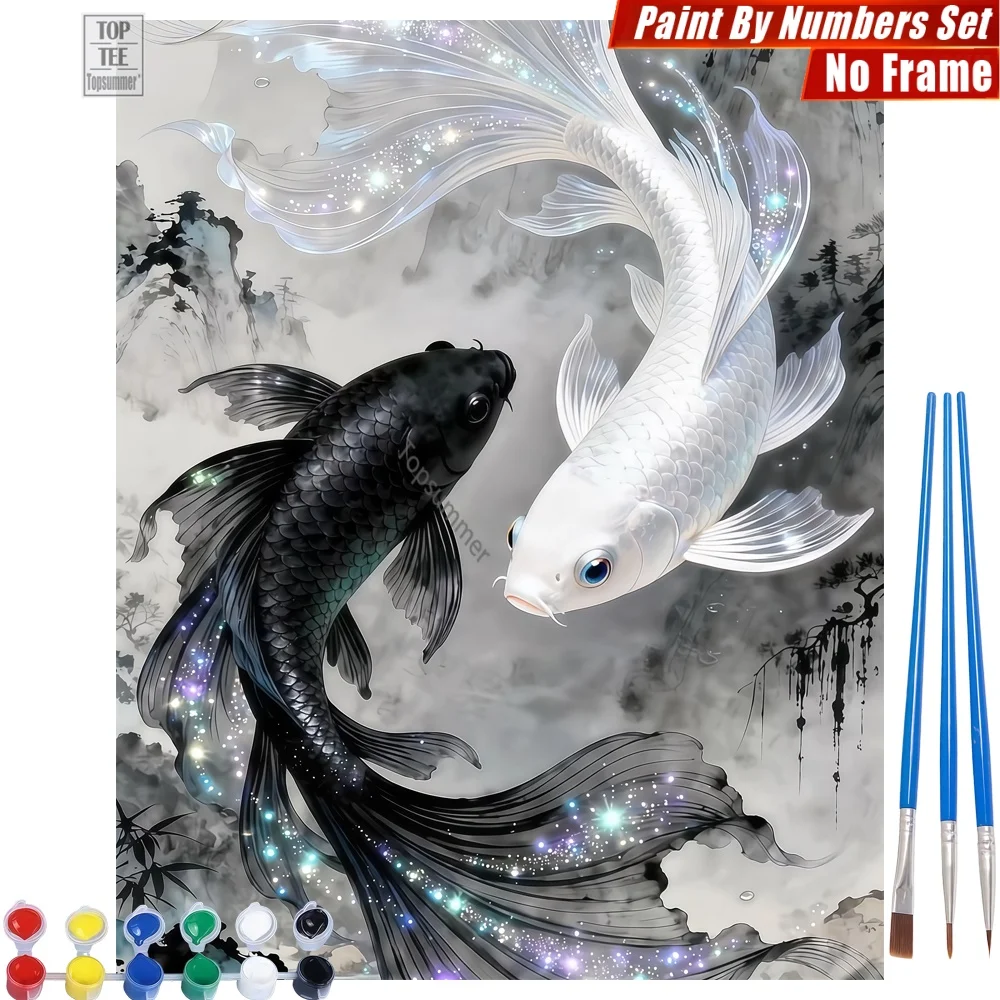 Zwarte inkt koi DIY verf op nummer set - Zwemmende oosterse glinsterende wanddecoratie voor thuis, Thanksgiving cadeau voor oma