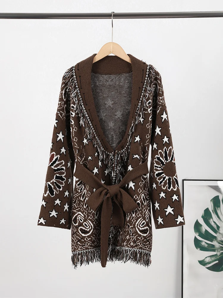 Vintage Jacquard Kwasten Lace Up Vesten Vrouwen Gebreide V-hals Volledige Mouw Vrouwelijke Trui 2026 Lente Dame Elegante Truien