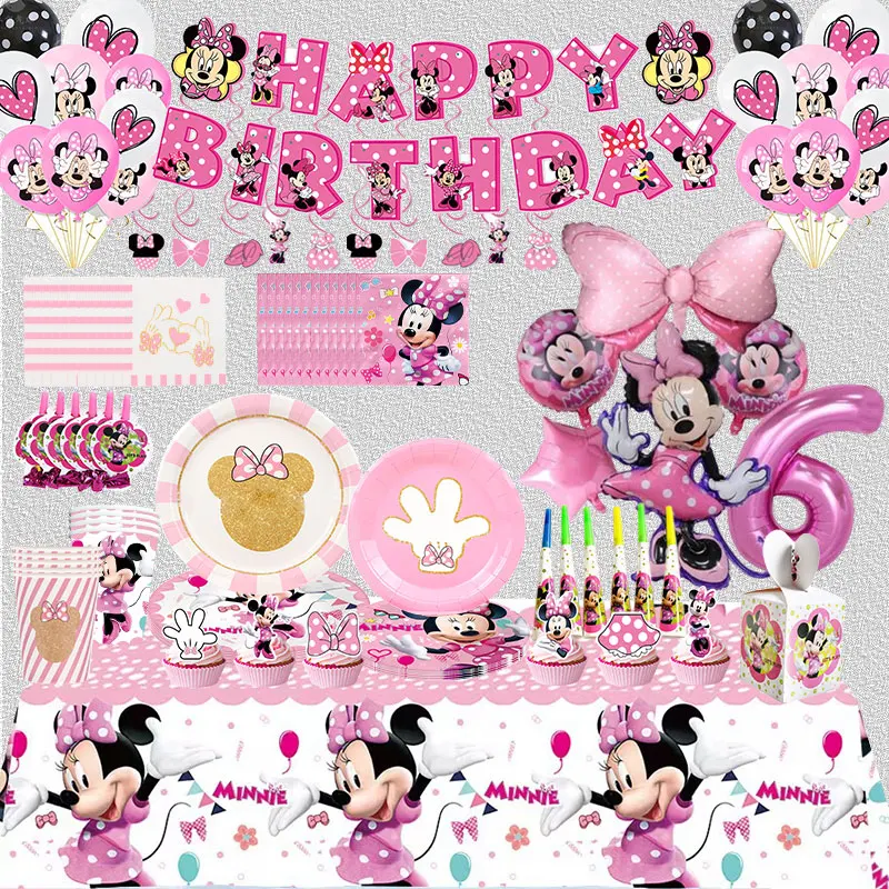Verjaardagsparty Minnie Decoraties Papieren Servies Bord Tafelkleed Minnie Verjaardagsartikelen Banner Blaasbare Kaart Taarttopper Hoed
