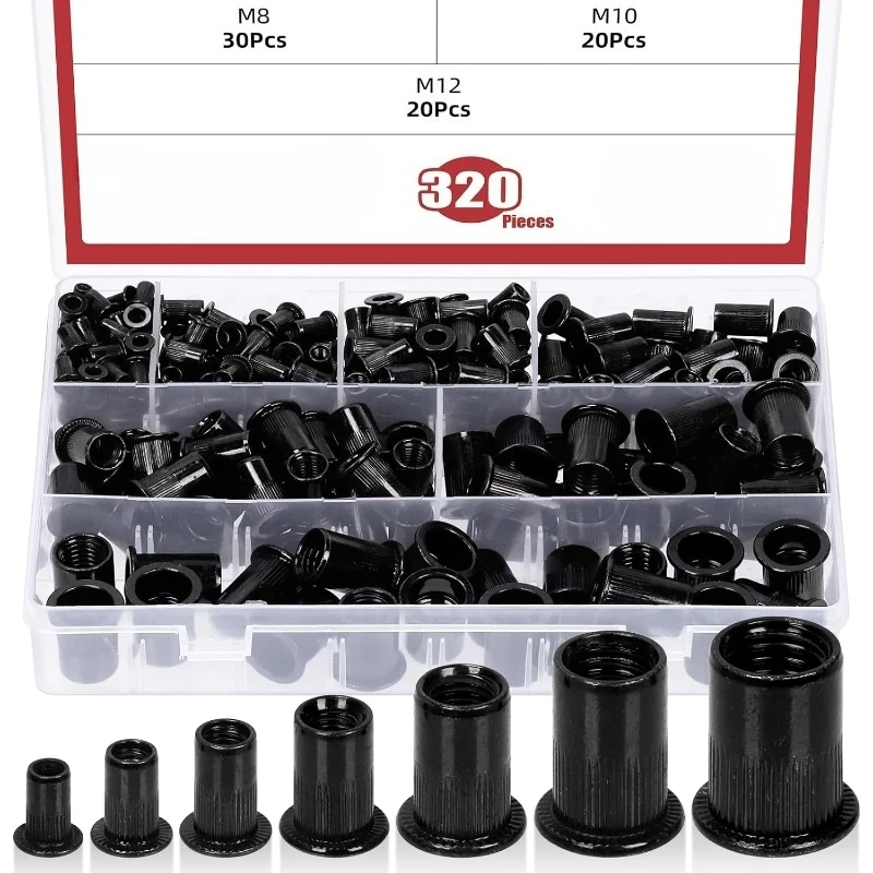 320 stuks Platte Rivetmoeren M3 M4 M5 M6 M8 M10 M12 Zwarte Koolstofstaal Platte Kop Geschroefde Rivet Insert Moerzetkappen Rivetmoeren