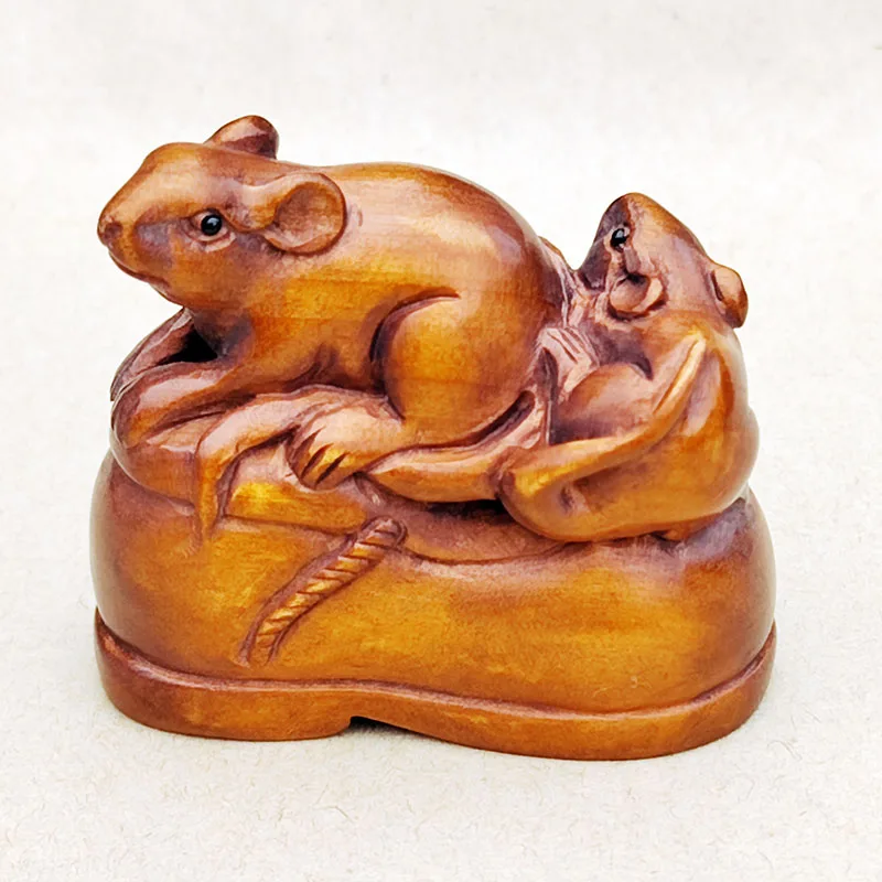 Y8982 - 2 inch handgesneden Japans buxus Netsuke-beeldje: 2 muizen op schoen Prachtig