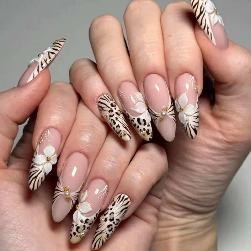 24 stuks nieuwe, zoete maar coole nepnagels met luipaardprint en 3D bloemen, luipaardprint Hottie medium lange nageldecoratie patch