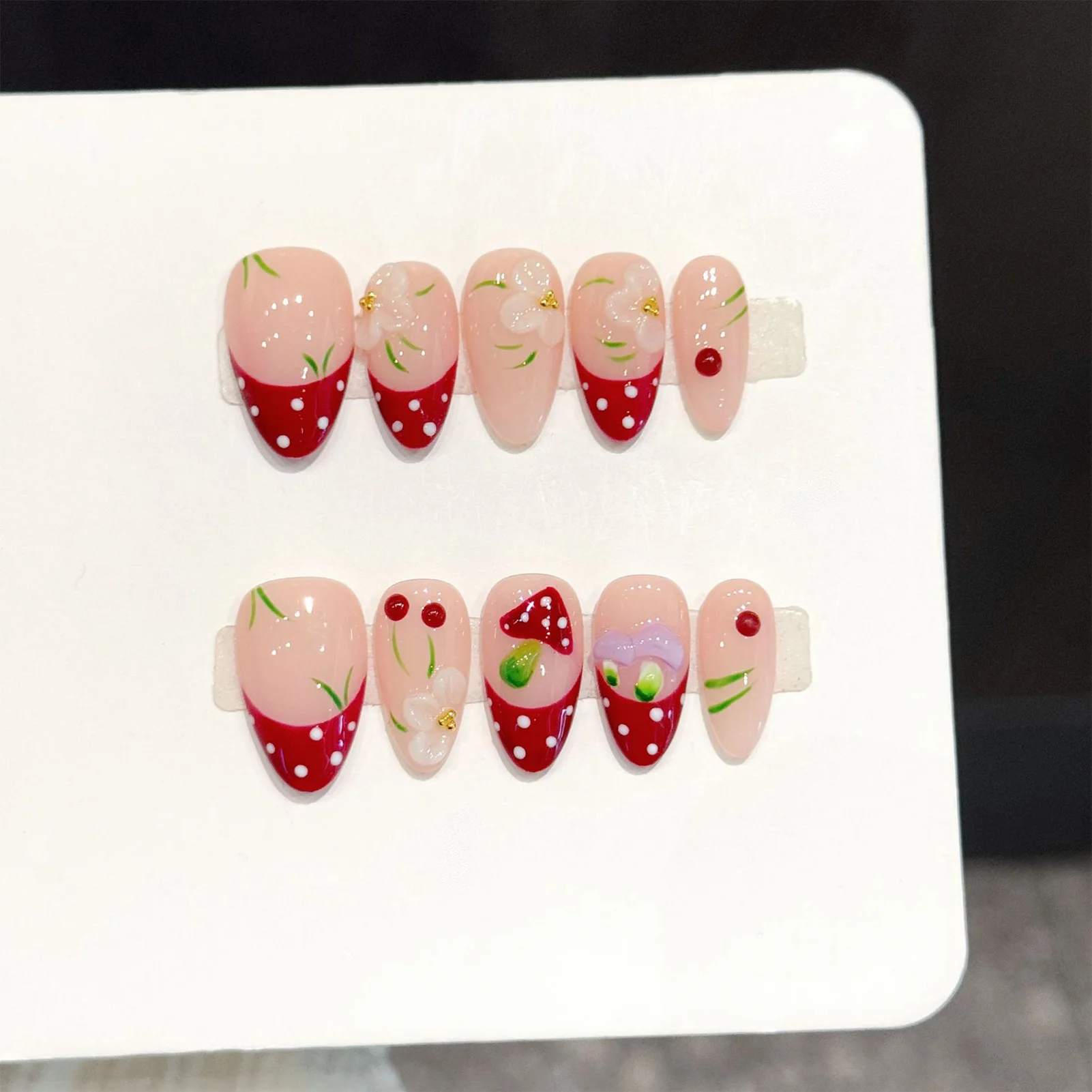 10 stuks rood-witte polkadot-design opzetnagels paddenstoel bloem decoratie valse nagels Franse amandelvormige nep nagel patches