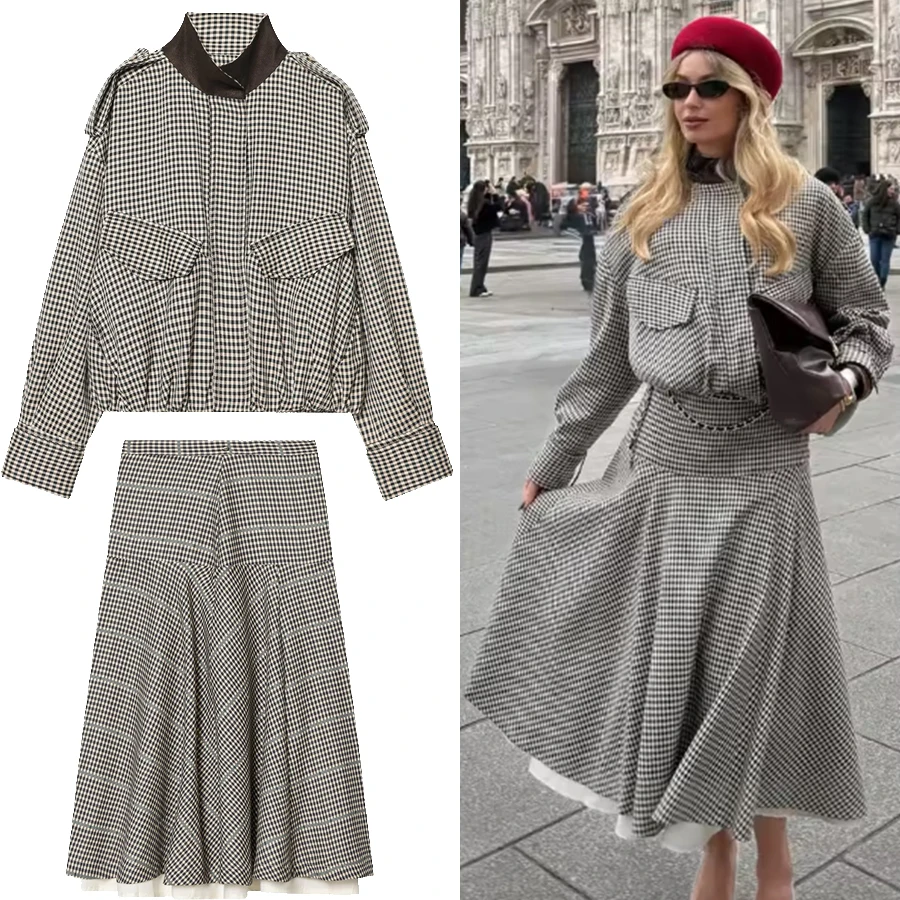 Elegante damespak met geruite pilotjas met enkele knoopsluiting + geplooide midi-jurk met zijrits en opgestikte details.