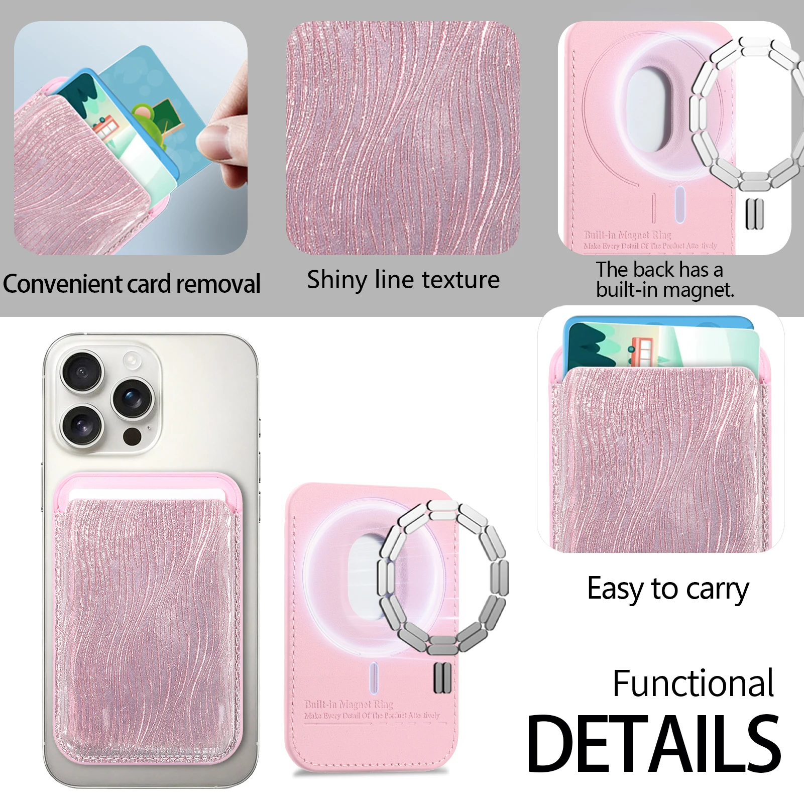 Glitter PU lederen kaarthouder geschikt voor Magsafe magnetische tape, magnetische ijzeren ring, telefoonhoesje, universele kaartportemonnee