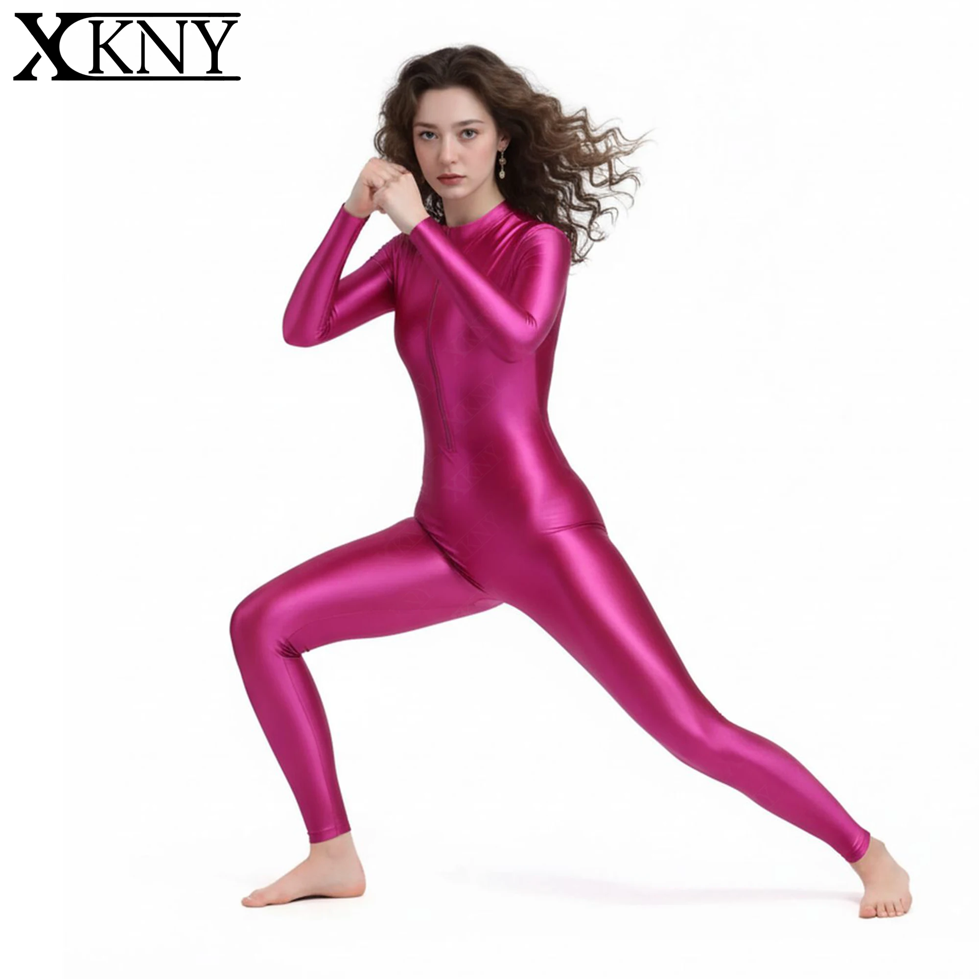 XcloCKNYoung satijnen glanzende bodysuit met hoge hals, rits, lange mouwen, strakke broek, zijden turnpakje, glanzend zwempak, wetsuit