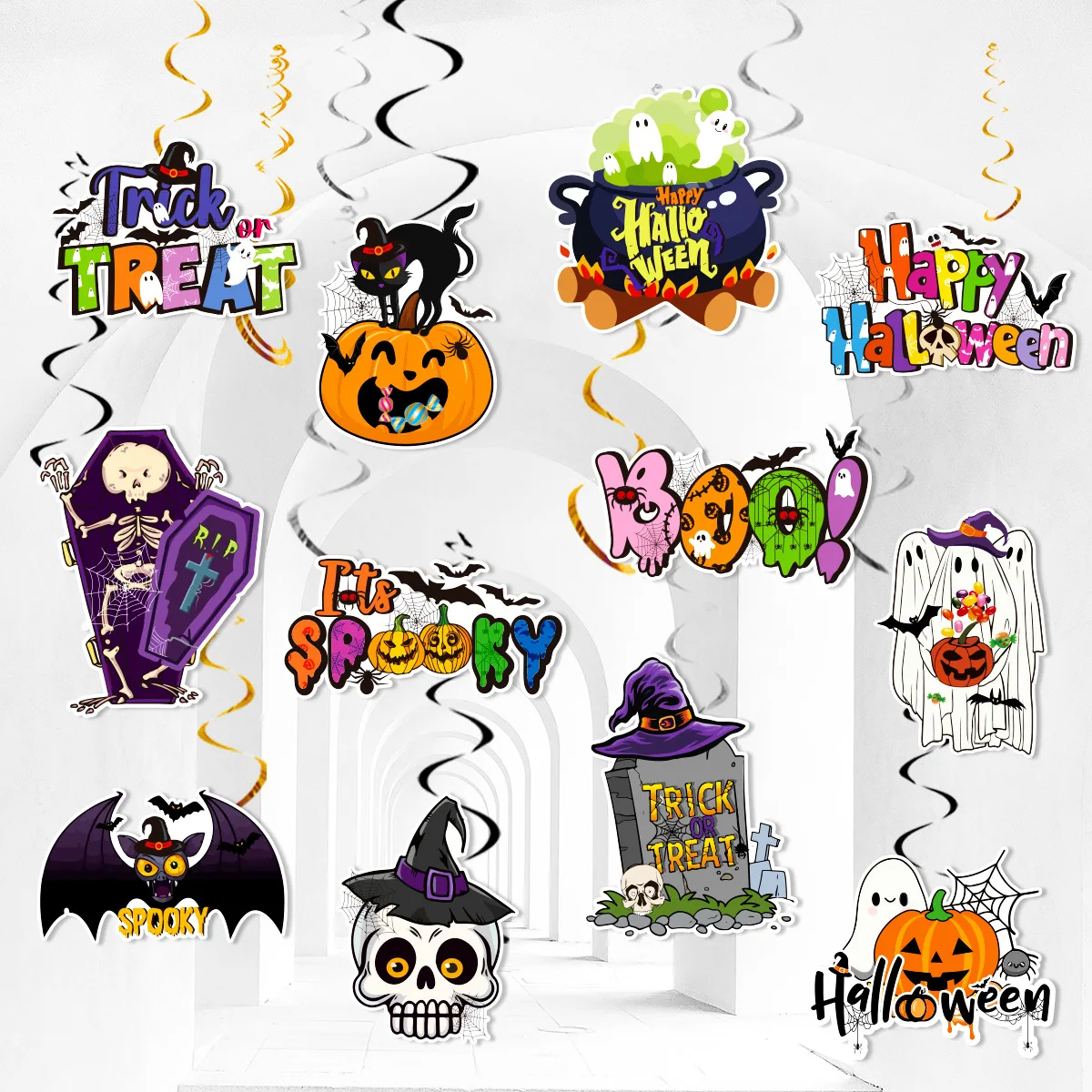 Halloween feestdecoratie spiraal hangend bord, spookfeestdecoratie griezelige pompoen skelet vleermuis charme spiraal hangend, 12 stuks