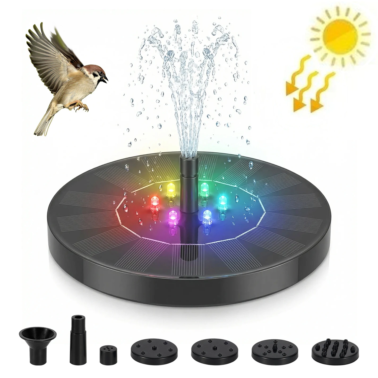 Zonnefonteinpomp met kleurrijk LED-licht, drijvende zonne-aangedreven waterpompfontein voor buiten, vogelbad en vijver in de tuin
